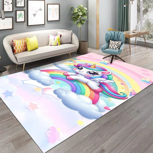 Cartoon Rainbow Unicorn Carpet for Girls Bedroom, Kids Nursery Play Mat, Bedside & Living Room Rug Decor